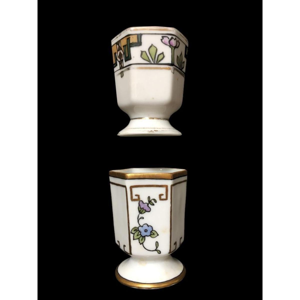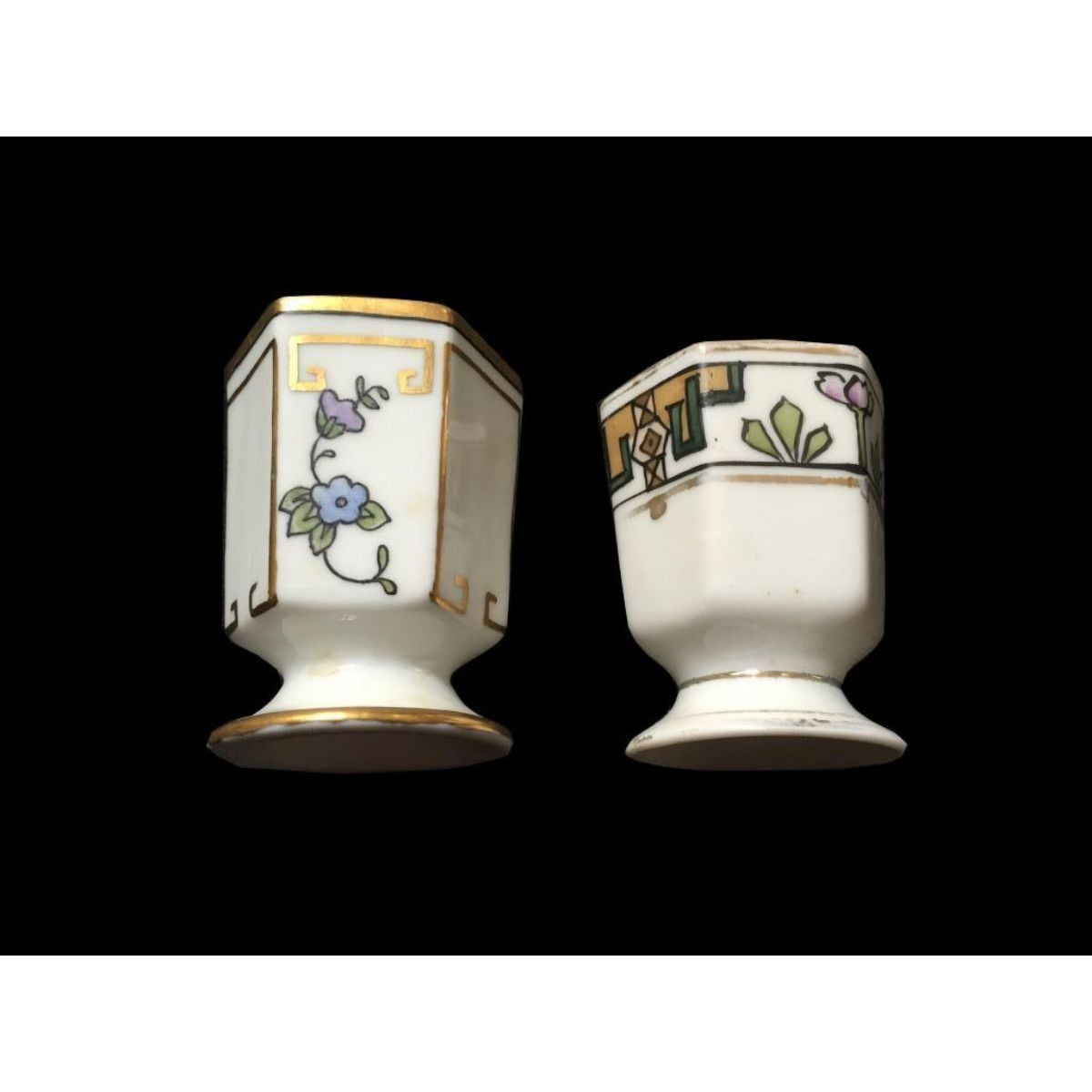 Vintage, Art Deco era porcelain polygon-shaped vases, toothpick holders, cups. Floral with gold pattern. Unmarked. 2 3/8" H X 1 3/4" D & 2 1/4" H X 1 3/4" D.