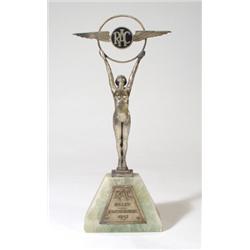 Art Deco RAC Rally Eastbourne 1935 trophy modelled as a nude maiden with outstretched arms clutching a RAC badge on an onyx base, 31cm high