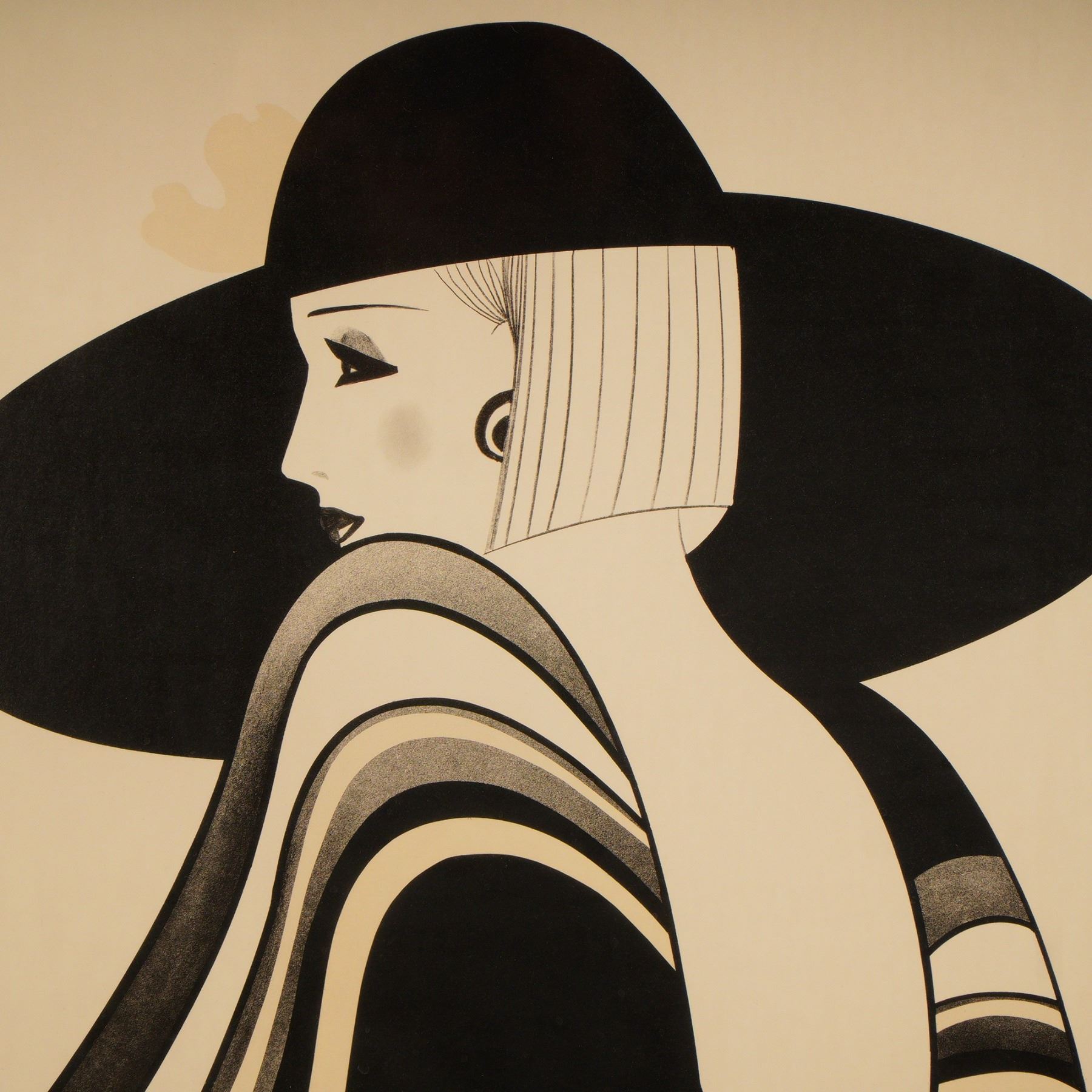 A captivating framed poster print that epitomizes the bold elegance of late 20th-century Art Deco revival. Rendered in strong black-and-white with subtle shading, the portrait depicts a chic woman in profile, her geometric bob haircut and oversized hat balanced by the sweeping curves of her striped garment. The composition exudes drama, glamour, and timeless sophistication, with the artist's stylized lines echoing both 1920s fashion illustration and 1980s graphic design. Signed in plate on lower left Jeannette 83. Presented in a complementary matted and glazed black frame, this piece makes a striking decorative statement and a collectible example of retro-chic design.