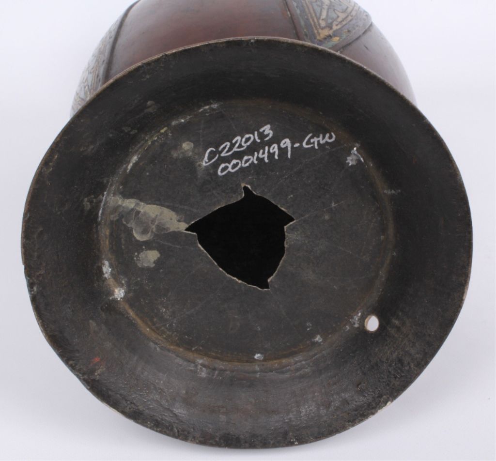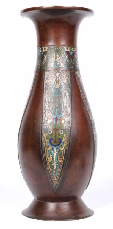 This piece is from the 1970's and is a spleter vase with a bronze patina and an enameled cloisonne pattern over the entire piece. Wonderful decor piece. The bottom has a slight hoel where it appears someone attempted to make a vase, but overall a great piece. This piece is 16.75" tall and 6.25"