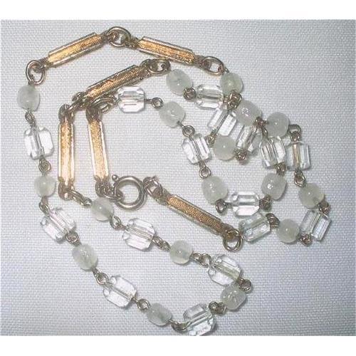 Fabulous Art Deco rock crystal necklace with ornate gold tone rod spacers of 3/4" in length which have a floral engraving and are Multi dimensional. The rock crystal beads are both polished and unpolished giving a clear and frosted appearance. The beads are both small and round and short and tubular. There is a spring ring close at the top. The gold tone is still bright and shiny and the total length is 21". Excellent vintage condition.