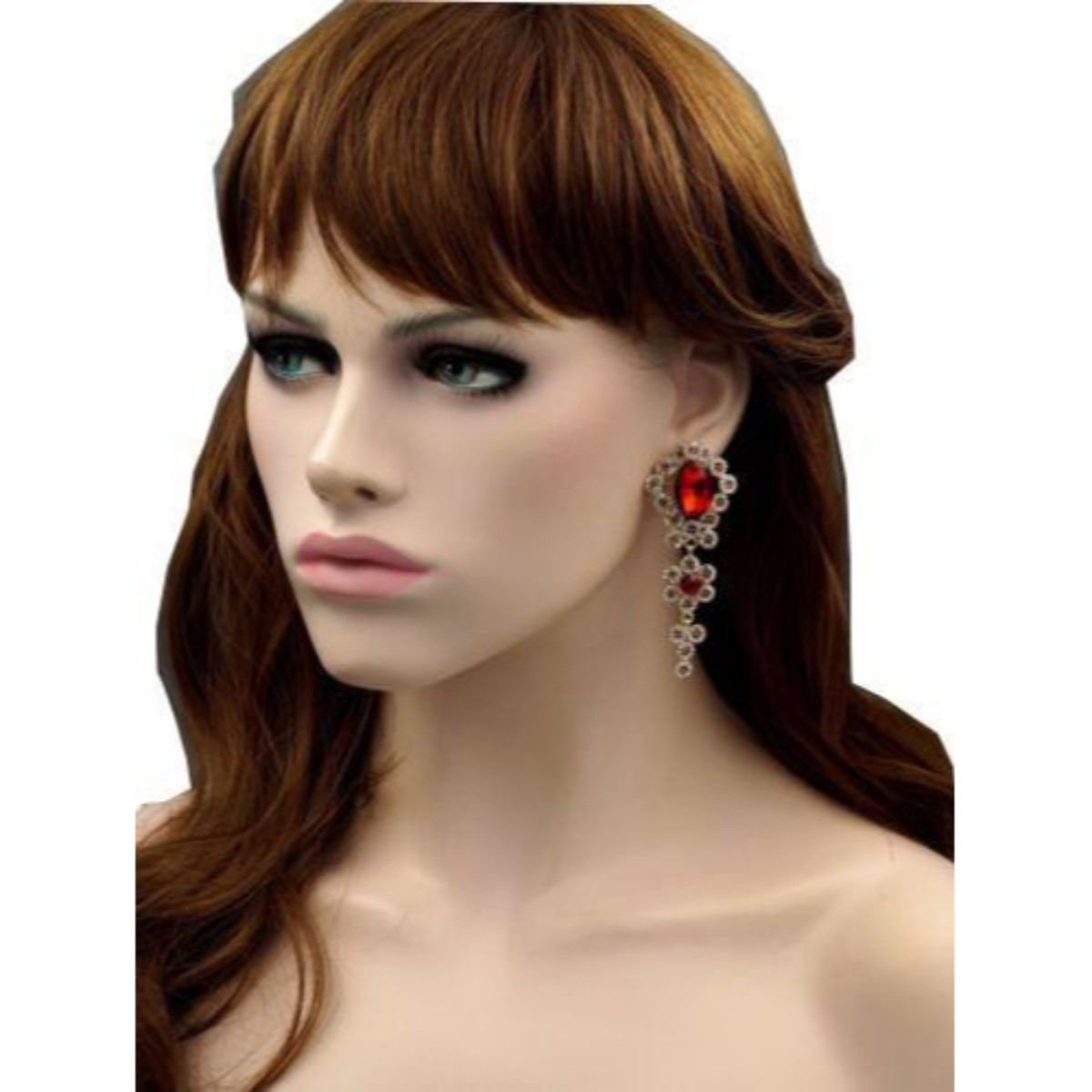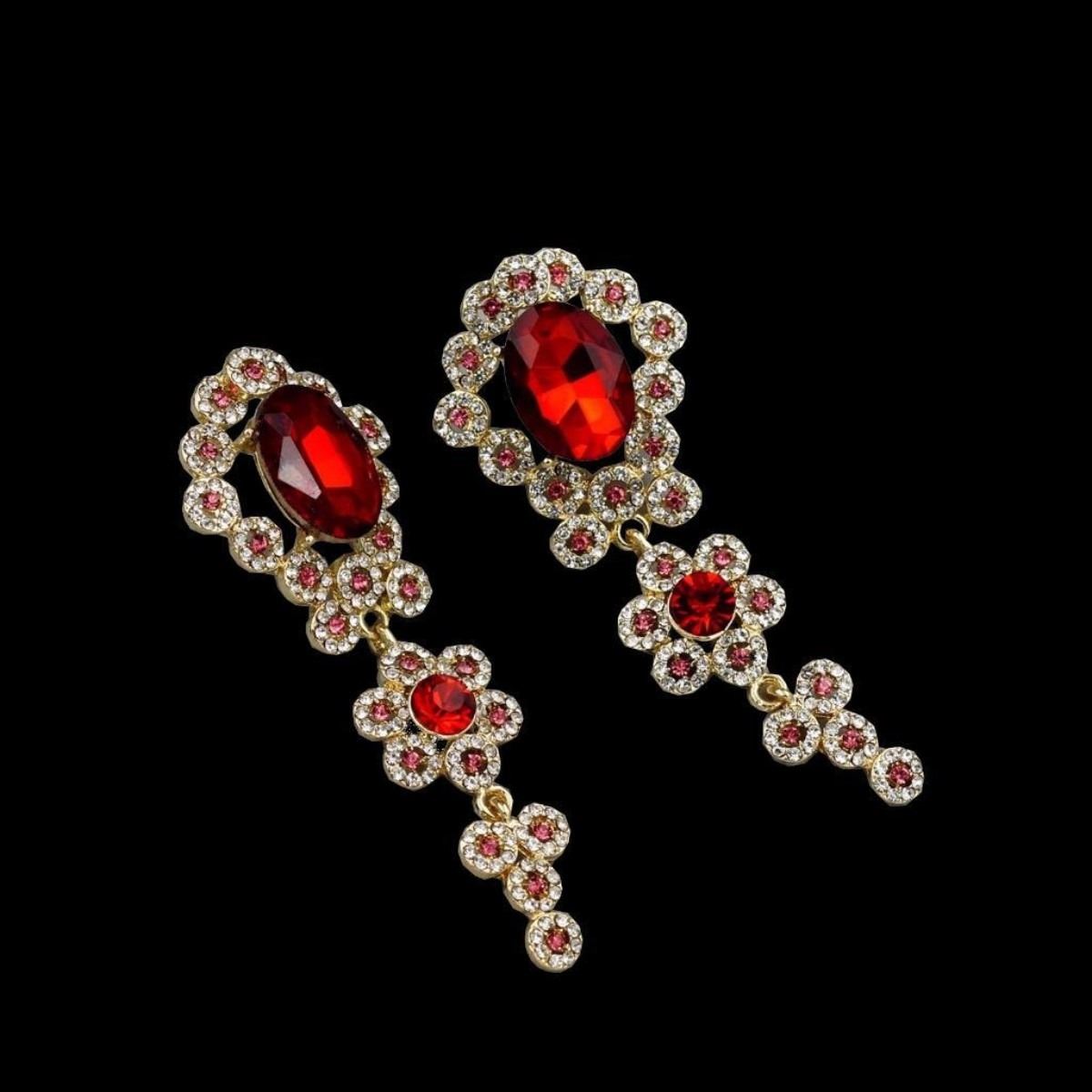 Art Deco -style ruby & clear Czech crystals set into 18kt gold plated  dangle drop earrings. 3"L.