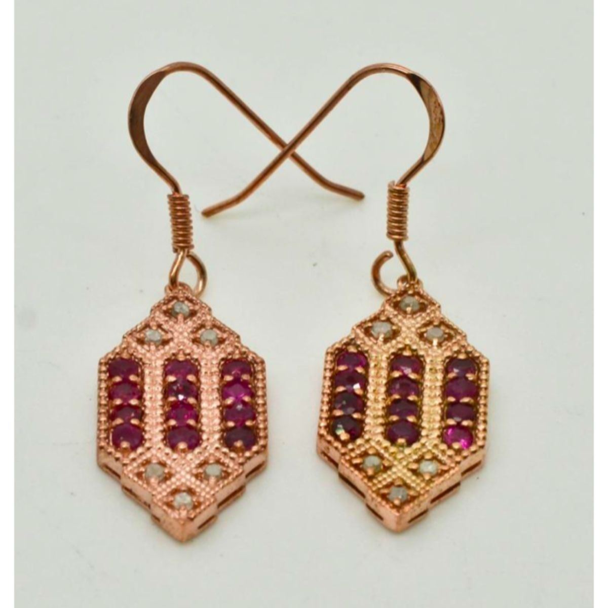 Art Deco-style 1ctw ruby & diamond hook style earrings. .03ctw X 24 natural round ruby gemstones, SI Clarity together with .02ctw X 12 natural round diamonds, H color, I2 clarity , set in 14kt rose gold over sterling silver. 38mm length, 11.47mm width. 4.7g.