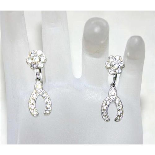 These wonderful signed Nemo antique Wish bone Rosette Earrings are made from Rhodium plated metal in the Art Deco period. Small Rosettes of Chaton Paste Rhinestones grace the ear lob while darling little Wish Bones dangle about 1 inch long. Signed on the back Nemo securing with a screw-back closure. Fabulous!