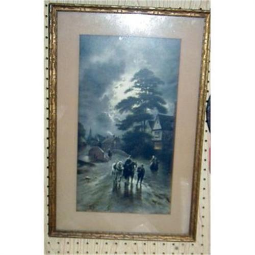 Exquisite print signed by J.W. Gozzard in left hand corner. Depicts a bridge during dusk with 2 men, one walking - one on a horse - church and tree in background. It is in greys and browns with a haunting sky. Narrow carved deco frame. Buyer pays shipping and handling costs.