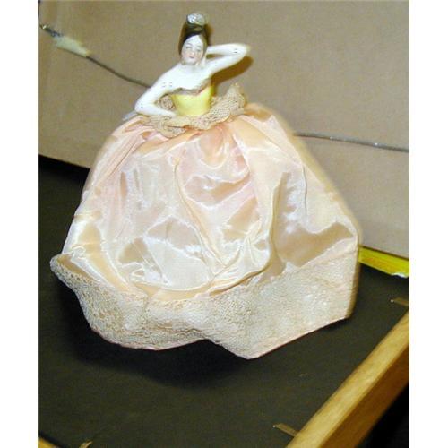 Art deco spanish lady pin cushion. It is porcelain with yellow top and black hair. It has smudges, loss of piece on the very top of head and loss of fabric around her yellow top. Bottom is orange taffeta skirt with lace. Under her skirt is a pin cushion. Buyer pays shipping and handling costs.