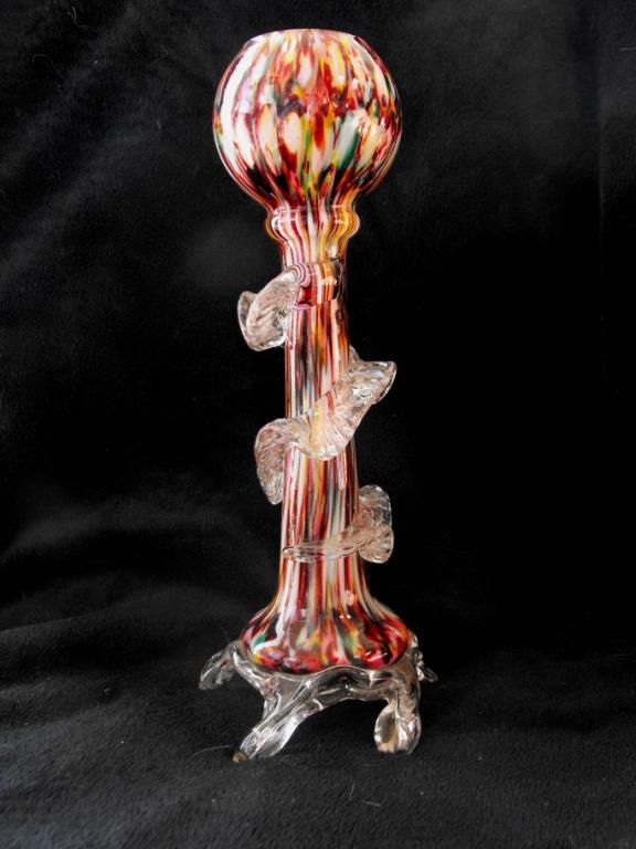 Bohemian glass vase is from Franz Welz. Vase is blown of cased glass with an applied, crystal ribbon of ruffles. Interior is opaque white and the exterior has honeycomb pattern in a rainbow polychrome mix.Entire glass is cased with crystal clear glass. Three out of five tips on the applied base have a chipped point. However, sits straight and is stable. No chips on the rim or applied rigaree on thevase. No hairline breaks were found on the vase or applied decoration. Excellent condition considering age and is mentioned for accuracy that truly shows from thepics, the vase displays lovely. Measurements: 8-3/4" tall, 1-1/8"diameter rim and the base is 3-5/8" diameter.