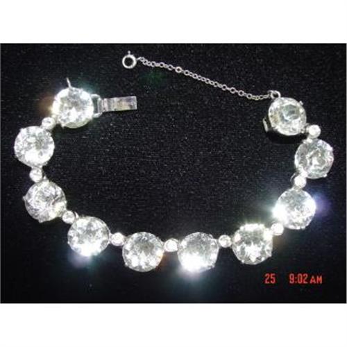 Here is a Art Deco Signed Sterling Crystal glass linked bracelet. I've never seen anything quite like this before, it is so heavy, this is very unusual, and attractive. This could even be pre 1910?? There is a safety chain to hold this heavy bracelet in place. There are 10 individual links with large crystal faceted glass beads, there are spacers with clear rhinestones in between the crystal glass links. Excellent condition
