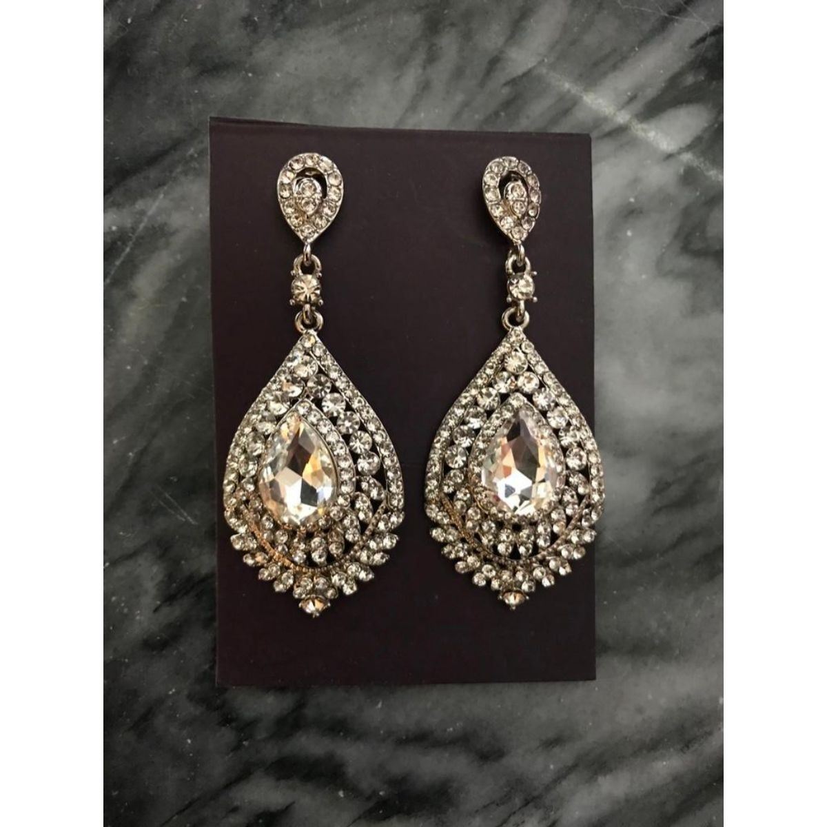 Pear shaped Austrian crystals, surrounded by clear rhinestones, set into Art Deco-style silver metal chandelier, dangle earrings. 2 1/2" L X 1" W.Â