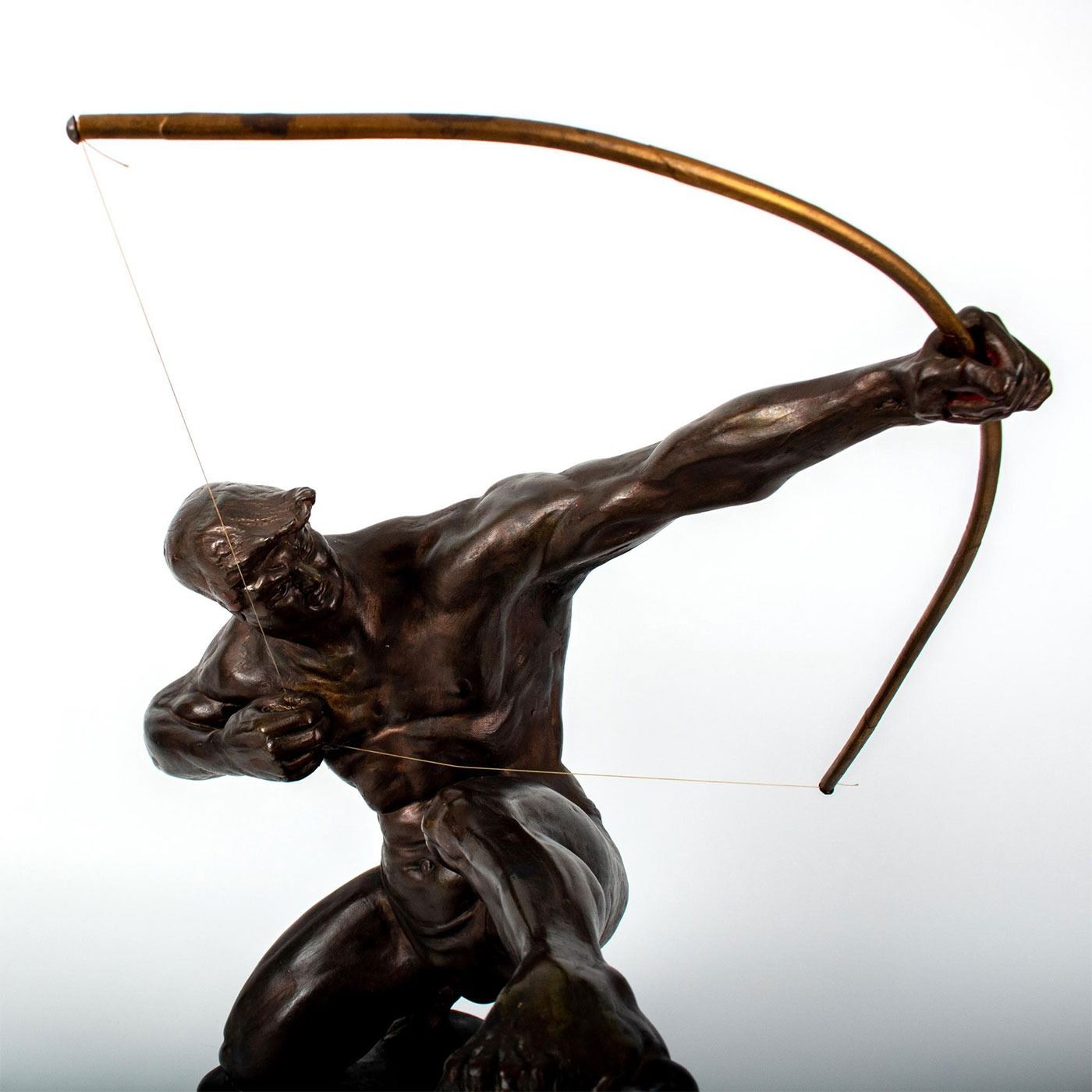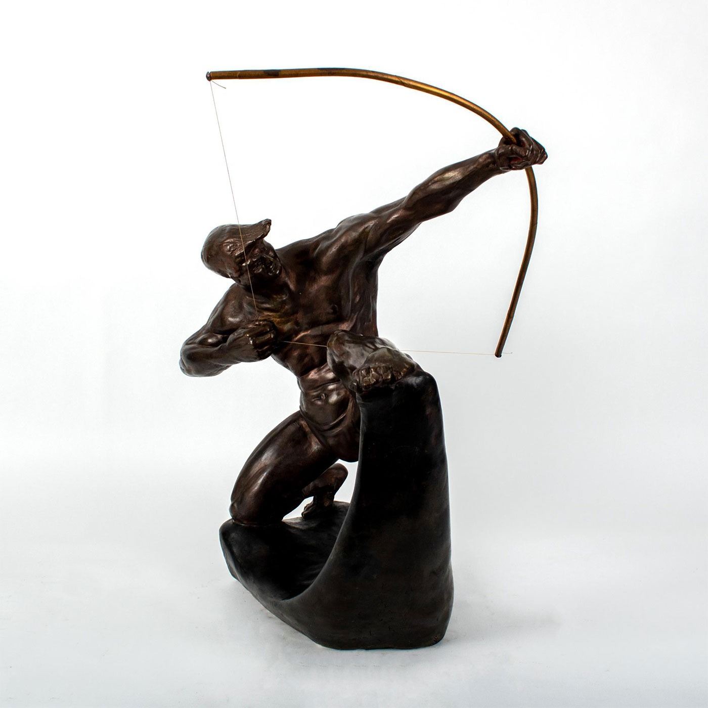 Depicts a large sculpture of a man with a bow. The bow is made out of string and gold colored wood. No artist signature. Very heavy sculpture. #sculpture #statue #bowand arrow #archer