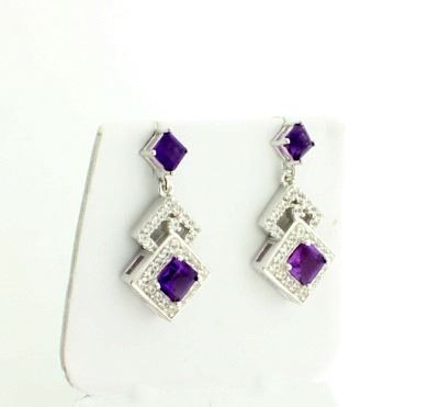 Each of these Art Deco inspired earrings contains a 4mm and a 5mm genuine Amethyst gemstone with awesome color accented with White Sapphires and set in Sterling Silver with Rhodium overlay for extra brilliance. The dangle measures over 1" for a larger look. 4.4g