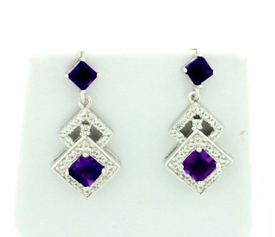 Each of these Art Deco inspired earrings contains a 4mm and a 5mm genuine Amethyst gemstone with awesome color accented with White Sapphires and set in Sterling Silver with Rhodium overlay for extra brilliance. The dangle measures over 1" for a larger look. 4.4g