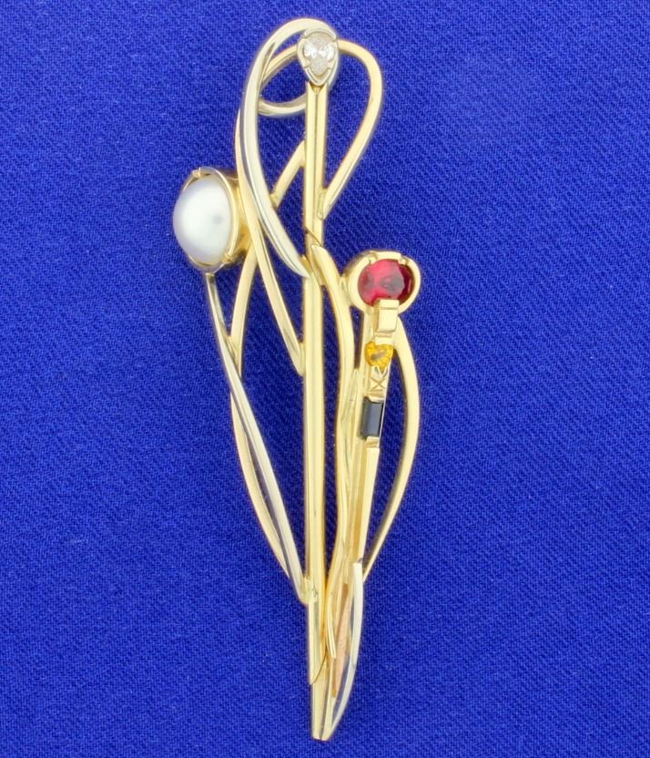 There are sapphire and Mobe pearl and ruby color stone. The diamond is pear shaped, 1/3 carat and 4.75mmx4mm with SI2 clarity and I-J color. The pendant is 3 inches long and is stamped "14k KV". 14.4g