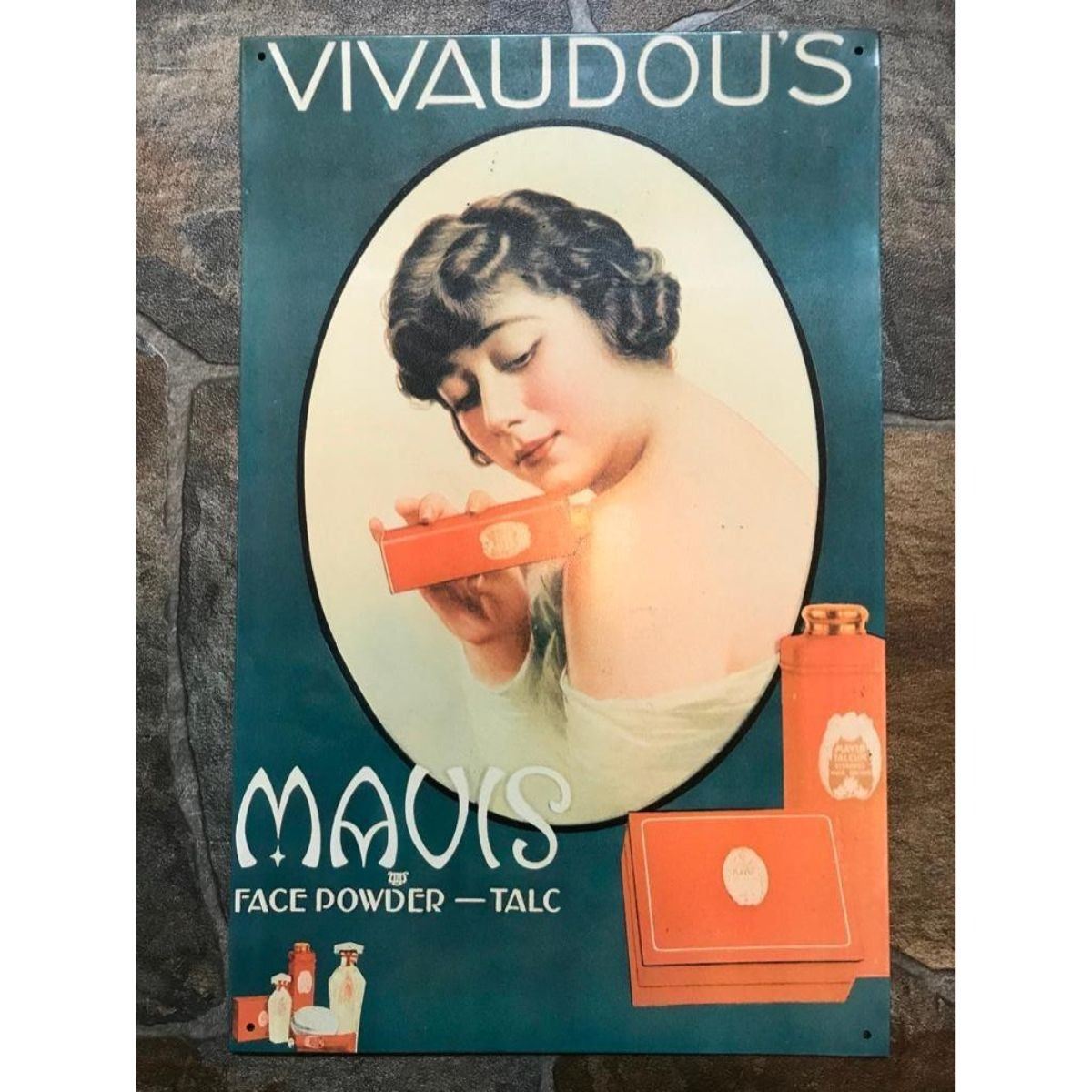 Modern, Art Deco-style metal advertising sign, face powder. 12" X 16" with pre-drilled holes for mounting. ** this is a used metal sign from the 1990's with signs of wear.