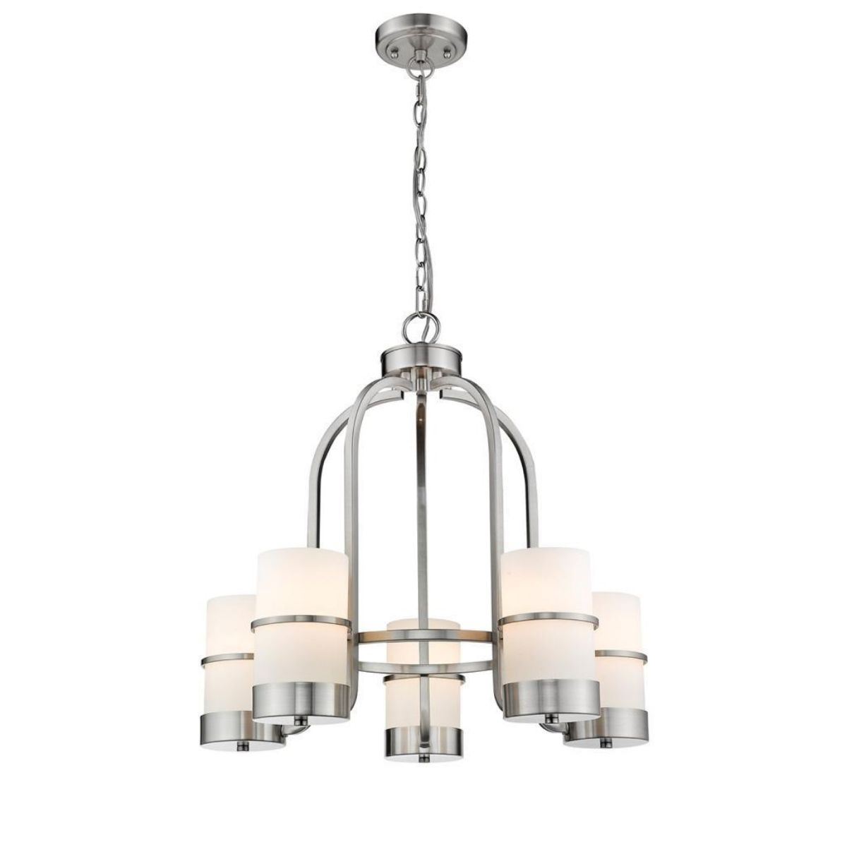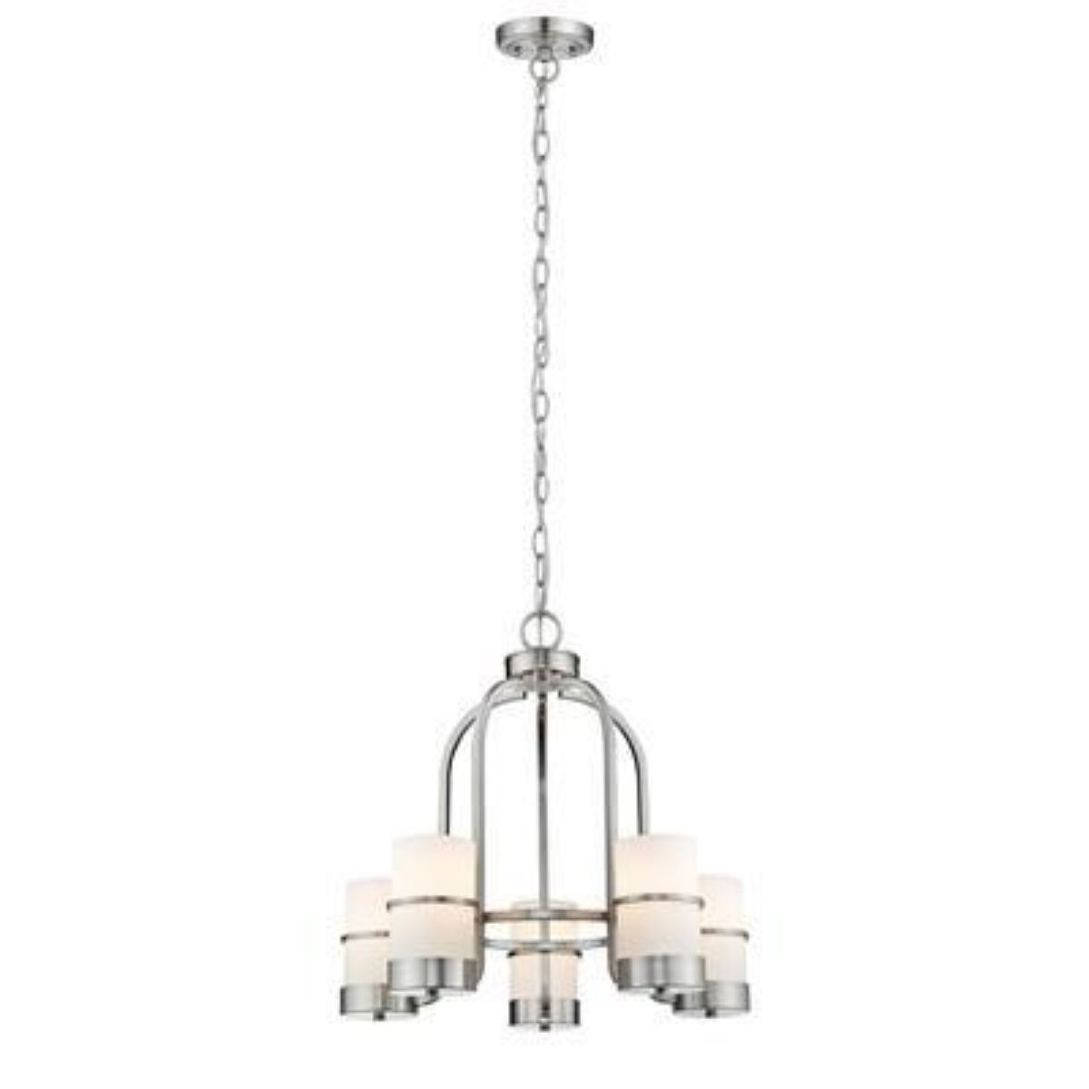 Art Deco-style 5-light nickel chandelier. 21" H X 22" L X 22" W. Etched white cylinder glass & brushed nickel.Â