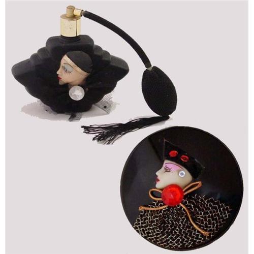 Black perfume bottle and powder box decorated with a three dimensional Italian style mask of a mime or a clown. In good used condition with minor signs of wear as shown. Please ask questions, request additional photos and shippíng costs before buying.