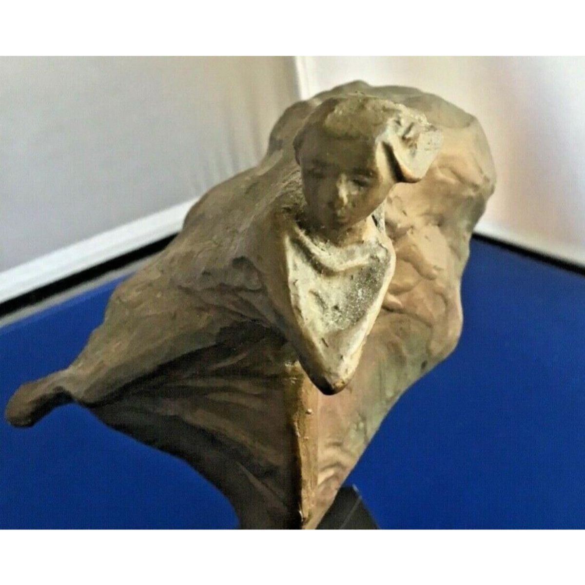 1975 Alva Museum Replicas gold tone stonework sculpture ( appearing to be bronze ) mounted on a black & white marble base, depicting an Art Deco style sculpture, Woman in the Wind. 7" H X 5" W.