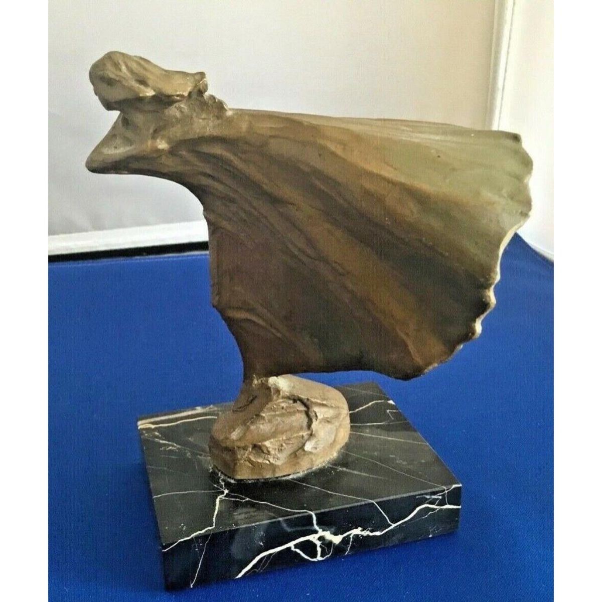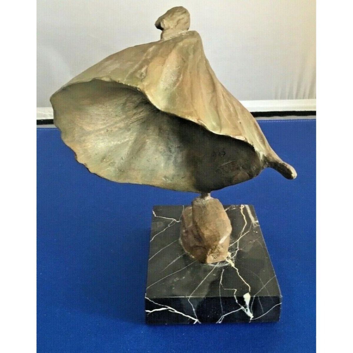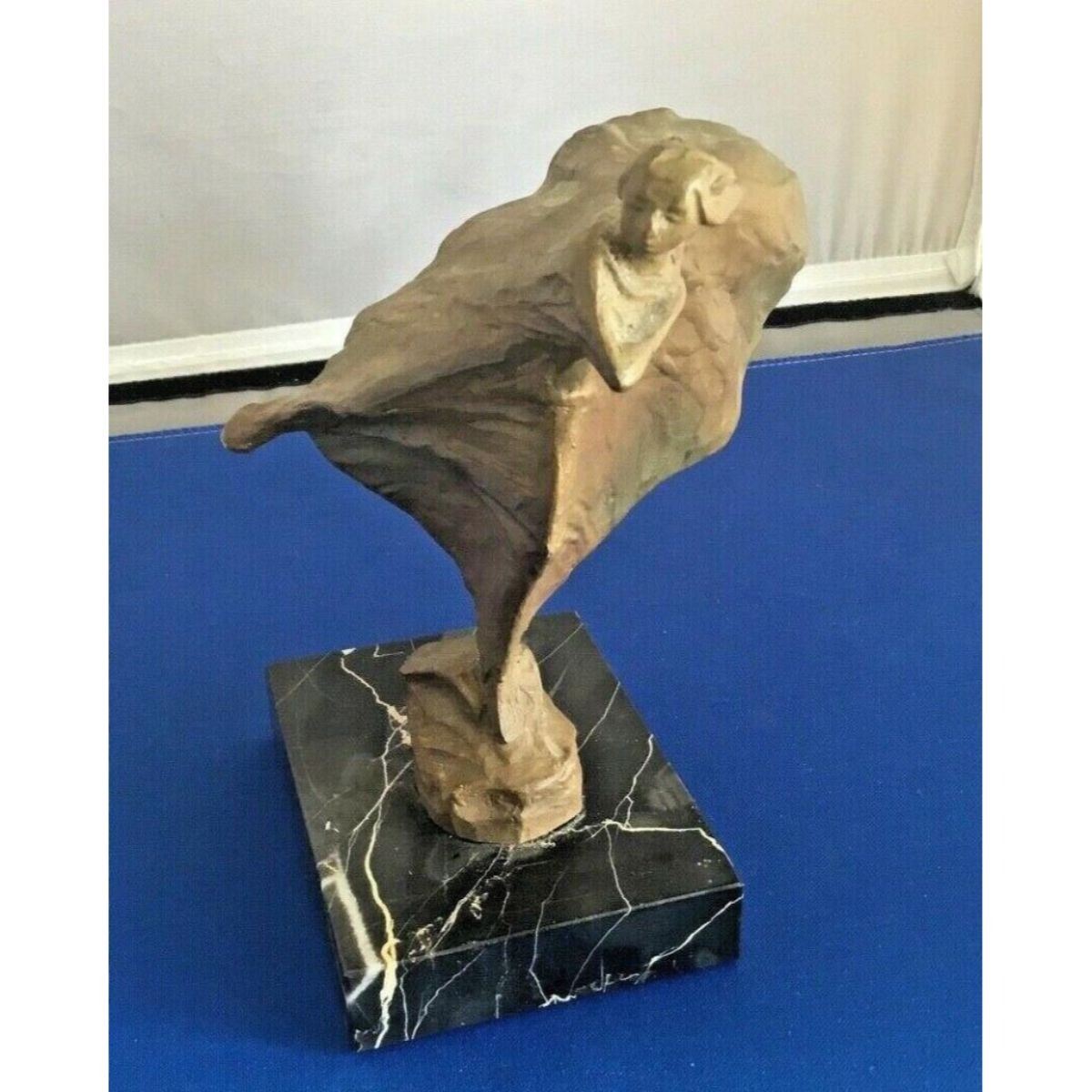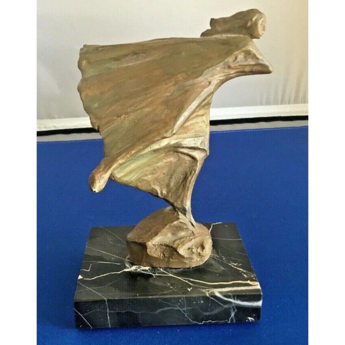 1975 Alva Museum Replicas gold-tone stonework sculpture ( appearing to be bronze ) mounted on a black & white marble base, depicting an Art Deco style sculpture, Woman in the Wind. 7" H X 5" W.