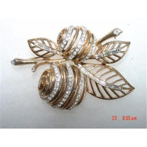 This is a sterling vermeil gold finish floral, acorn plant?? brooch. It has different shapes of clear rhinestones throughout the acorns and flowers. There are a few spots where the sterling shows through. Extremely rare and unusual Trifari Art Deco piece. Feel free to make an offer