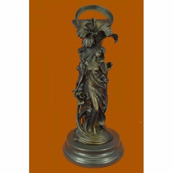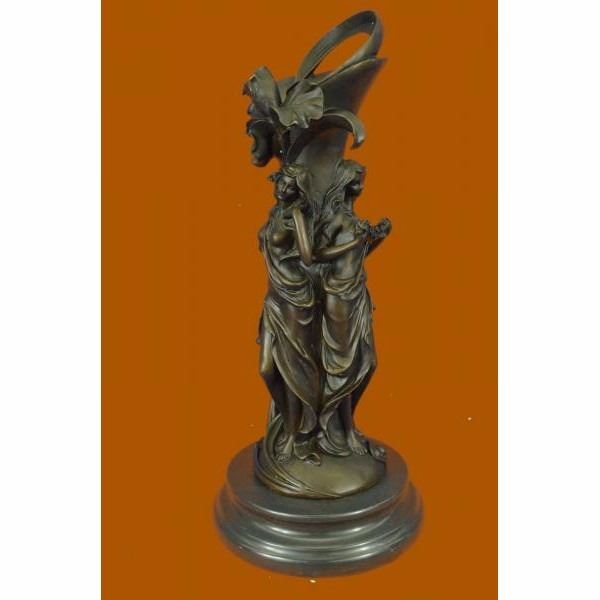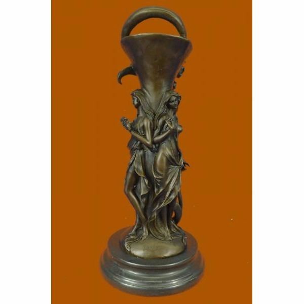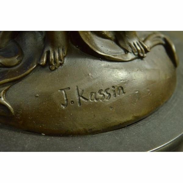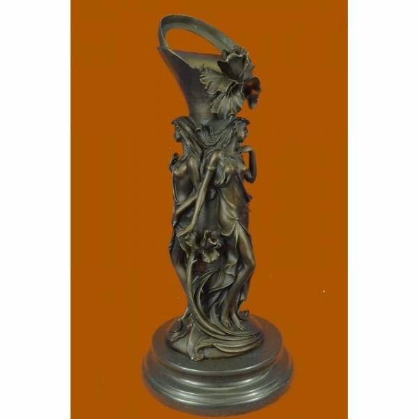 An exquisite vase that would be the center of attention in any room. Three nymphs surround the vase. They spread the hem of their long gowns, as they hover over the ground. Each dress is subtly different. The nymphs seem to grow like blossoming flowers. Vines and flowers creep around them, almost a part of them. This unique piece can act as a flower pot or just an eye-catching addition to your abode. The vase itself is a brown patina. The nymphs are brown as well but their gowns, vines and flowers are brown as well. 100% bronze and handmade, this sculpture was cast using the "Lost Wax Method" and mounted on a marble base and is signed by artist J.Kassin. Condition : This sculpture is in perfect condition. Bronze Dimensions with Marble Base:Height 18" x Width 8" Marble Dimensions: Diameter 6". Height without base: 16" Weight : 19 LBS Inventory; 53YRD13358335