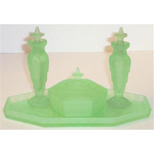 A fantastic find, this sensational green frosted glass vanity set contains two perfume bottles, a dresser jar and a tray. Shown on page 131 of Whitmyer - Bedroom & Bathroom Glassware of the Depression Years, and attributed to Tiffin / US Glass. The Art Deco stepped design of the perfume bottles is repeated on the lid of the dresser jar and the same geometric pattern runs through the bottles, jar & tray. Unique and apparently rare in this frosted green color that fluoresces under black light. Rarer still to find both perfume bottles, their stoppers & daubers, the jar, it's lid, and the tray all in excellent condition.