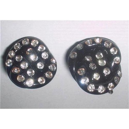 A stunning pair of black twisted Bakelite earrings with six vertically aligned rhinestones at the centre encompassed by swirls of twisted black Bakelite with an additional fourteen inset clear rhinestones on each earring. Each earring measures 3/4" in diameter and have silver tone screw back fittings. The rhinestone are all still very sparkling, excellent condition. Matching brooch available at time of listing.
