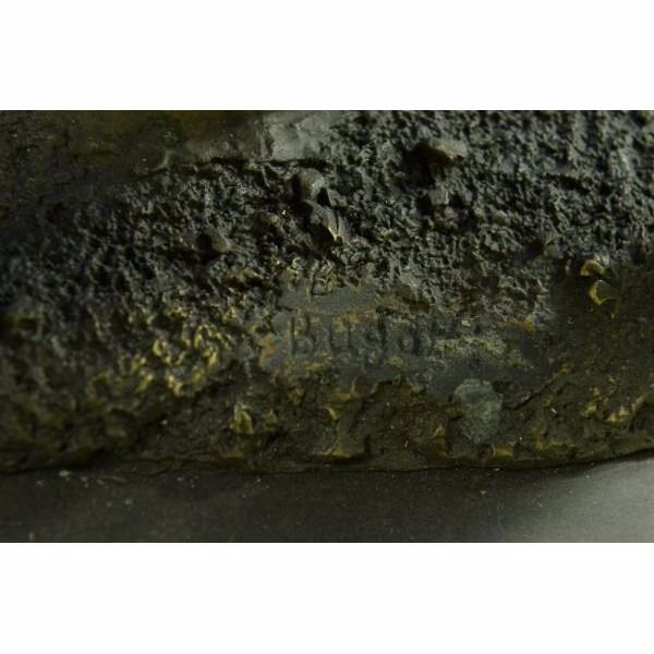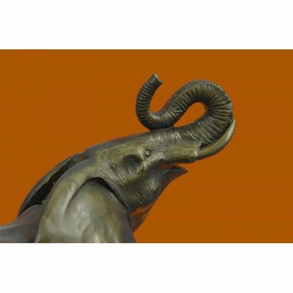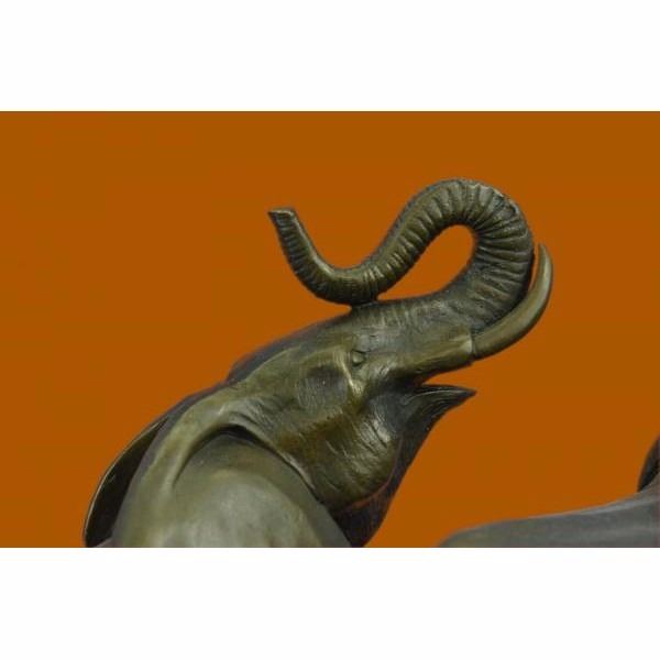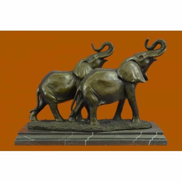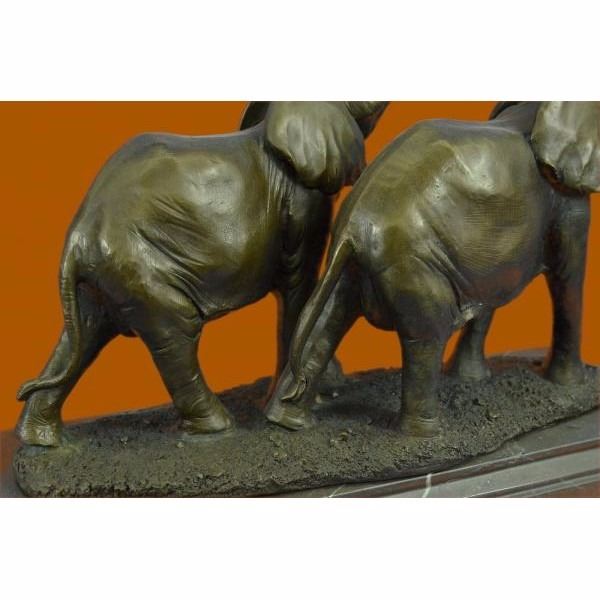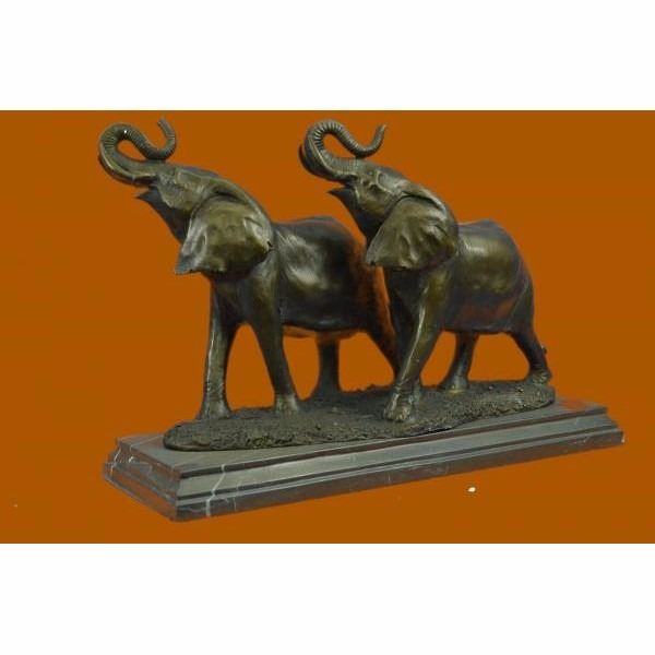 For years the elephant has been known as a sacred animal in the East. As the largest animal to walk the Earth, the elephant is known as a symbol of strength and power. It also represents perseverance, in that it is an extremely hard working animal. Elephants are also seen as symbols of wisdom and dignity, because of their incredible intelligence and very long life span. It is believed that an elephants trunk being raised up is a symbol of good luck, fortune, and optimism.The elephants were cast using the ancient methods of lost-wax casting and stained with brown patina finish for preservation. They are mounted upon a black variegated marble base with the artist Bugatti signature. Condition : This sculpture is in perfect condition. Bronze Dimensions with Marble Base:Height 12" x Width 18" Marble Dimensions: 18" x 7" Height without base: 11" Weight : 35 LBS Inventory : 68YDW15112586