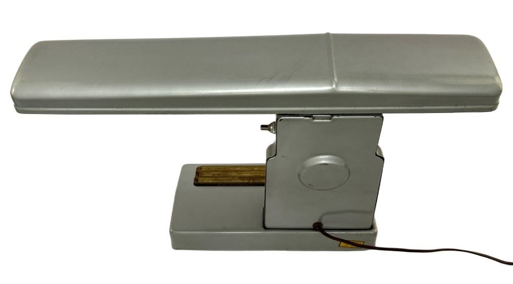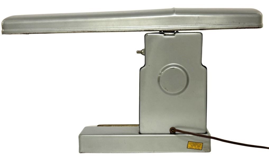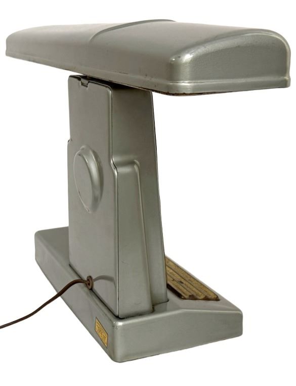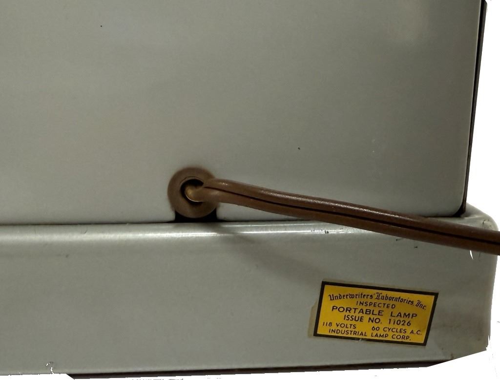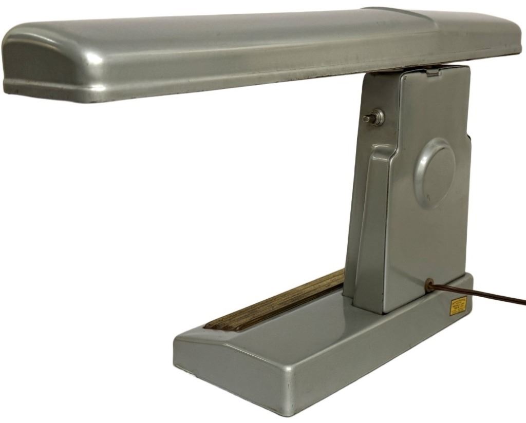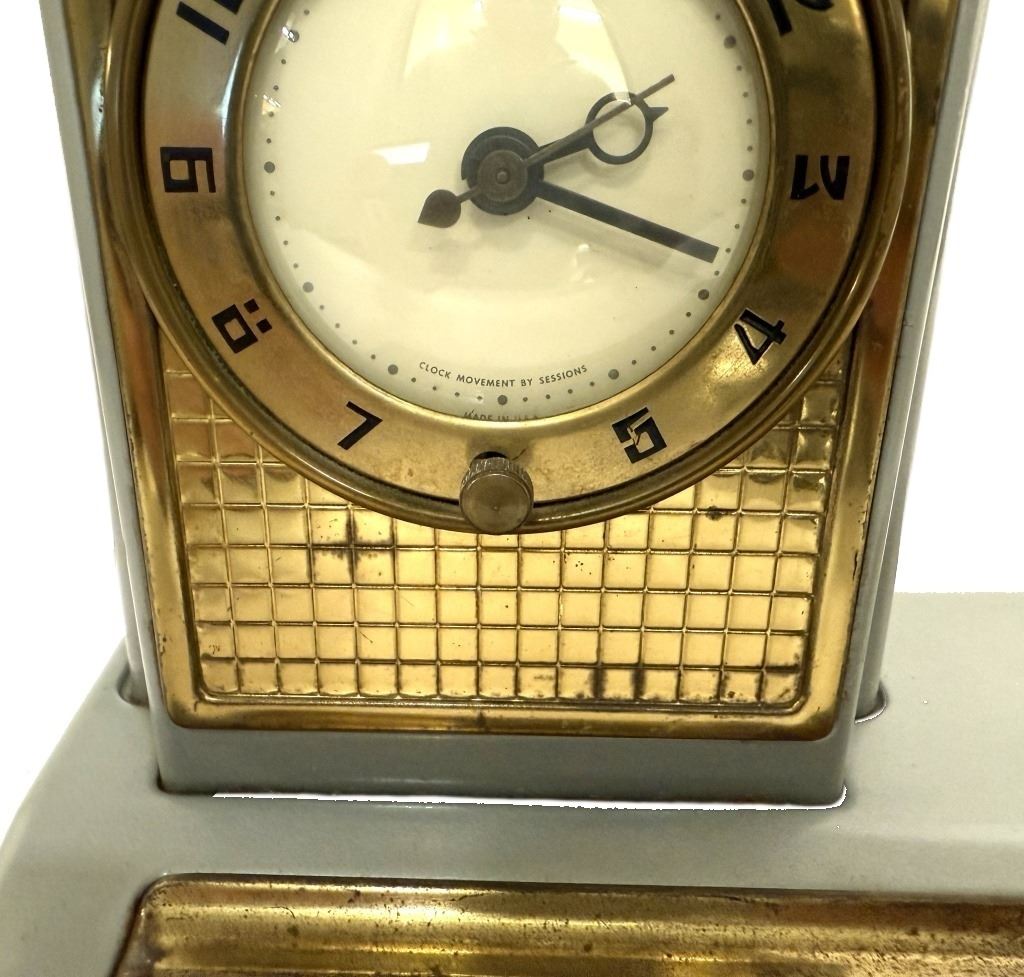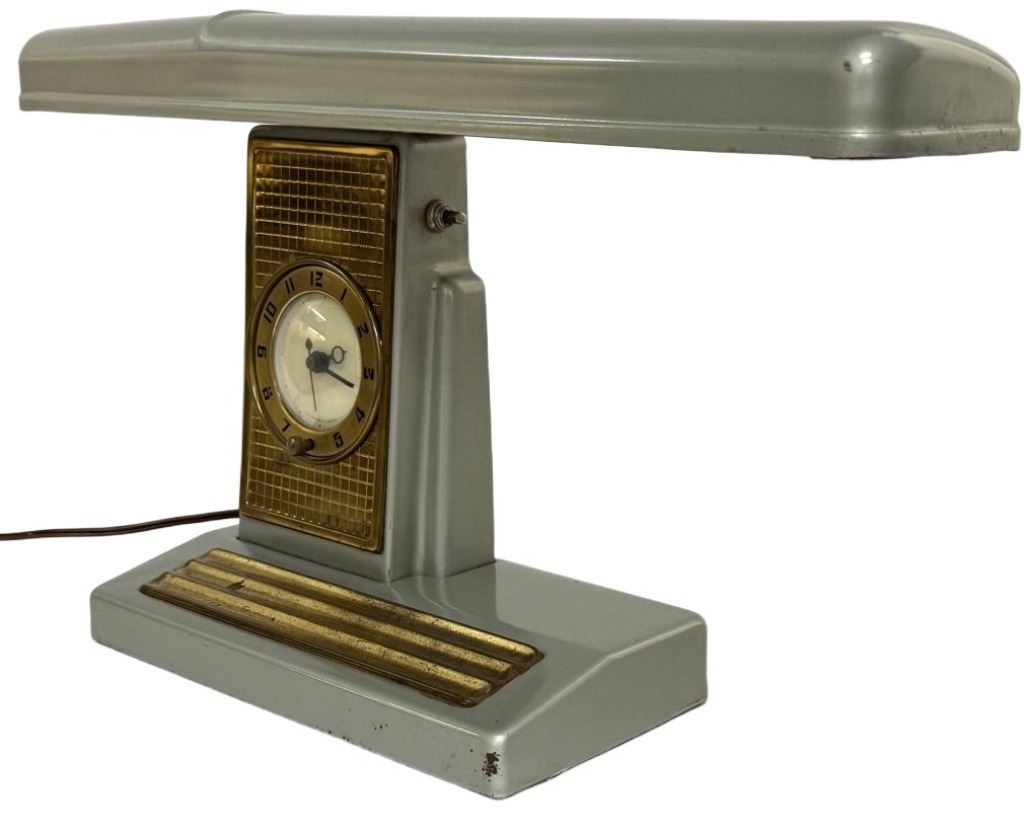 Item/Description: The Underwriters Laboratories lamp and clock showcasing mid-20th century design. Featuring a Sessions clock movement, this piece is characterized by its streamlined industrial aesthetic, crafted from metal in sophisticated gray and gold finishes. Manufactured during the 1940s and 1950s, it features an Art Deco inspired mid-century modern design that captures the transition between these two popular vintage styles. Made in USA.