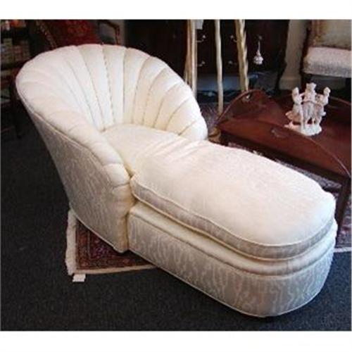 Beautiful Art Deco Chaise c.1920's. This piece has been completely refurbished and upholstered in a beautiful cream on cream soft cotton fabric. Fan shaped back and soft poly filled pillow make this piece an extremely comfortable chaise. The lines are great. It's a style that you don't see very often. The total width of the back "fan" part is 32"W. Wonderful accent piece!