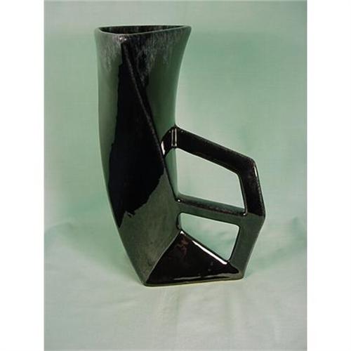 9 inch Tall ** Twisted Triangle Shape with a Two Decked Handle and 5 inch Triangle Base ** Midnight Blue Shiny Glaze ** Signed Anna Van Briggle, Colo. Spgs. ** Circa 1920s ** Excellent Condition