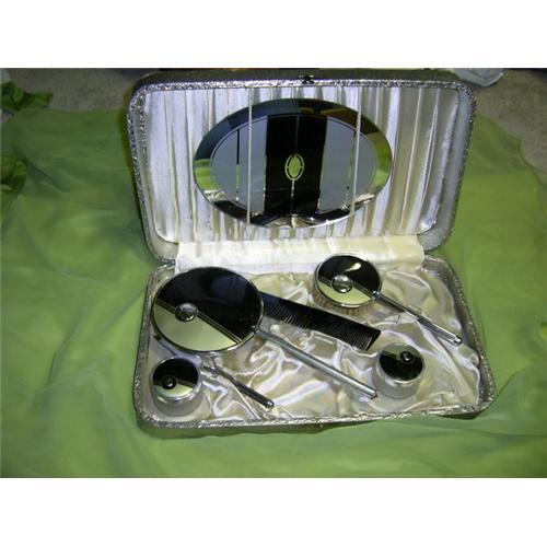 A beautiful Art Deco vanity set in the original filled silver box. This set was put away in a dresser drawer and only the mirror was ever used.