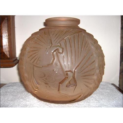 Moulded in Rose coloured glass and styled with a superb geometric interpretation of Swans.Etched signature to collar and offered in perfect and original order.