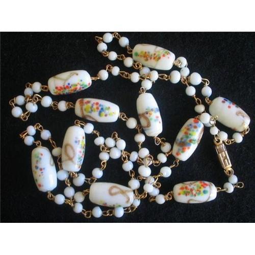 Perfect for Summer! delightfully feminine and dainty. Milky white glass beads with swirls of gold glitter hand painted along with pastel coloured tiny flowers in reds, blues, greens with a touch of yellow. Each bead slightly different and individually hand crafted. There are ten barrel shaped beads connected by smaller plain white glass beads and the chain that connects is made up of very fine and delicate gold tone links. It fastens with a fancy die-stamped flat box style clasp, although this necklace will slip on and off over the head very easily. Total length is 30" not including the clasp and the condition is excellent.