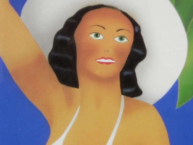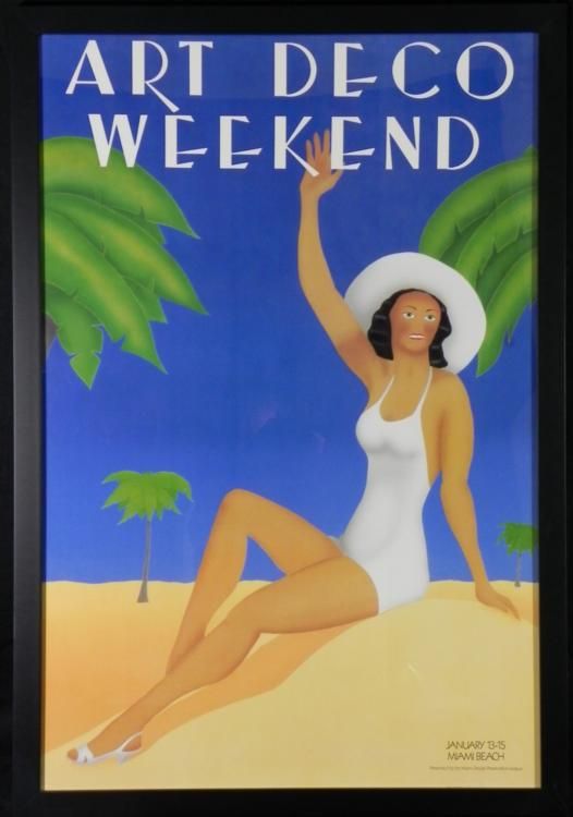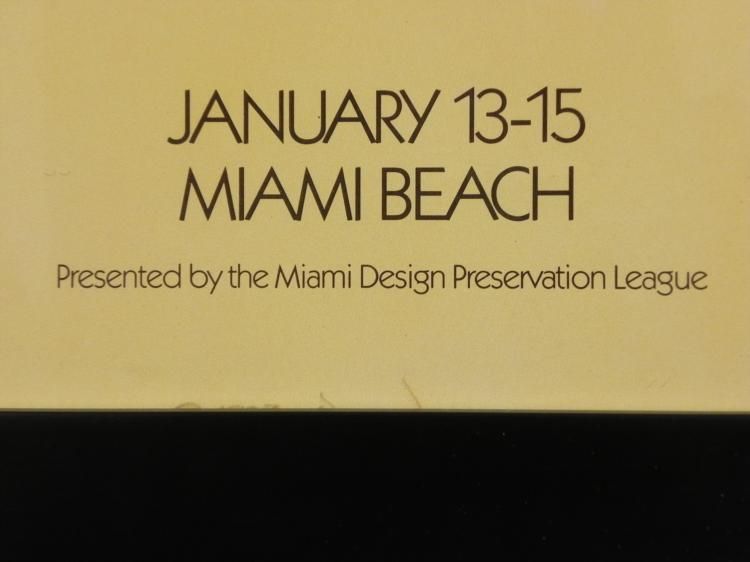 This poster combines the natural beauty of Miami Beach with an Art Deco Bathing Beauty! It was done for the fabulous event that took place in South Beach in 1983. * * Artist: Woody Vondracek * Medium: Print on glossy paper * Year: 1983 * Image size: 22 1/2 x 34 inched * Framing: In matte black laminate frame * Frame size: 25 x 36 1/2 inches * Condition: Excellent