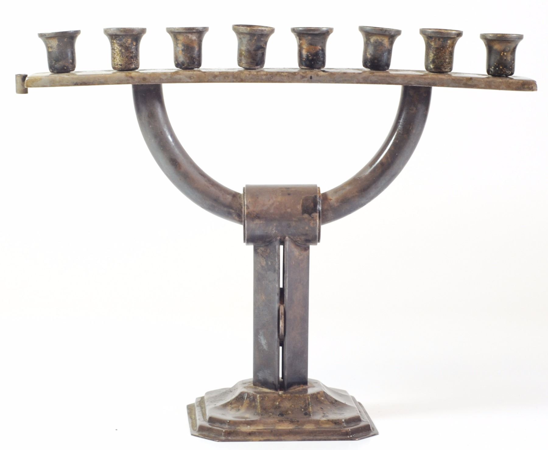 Art Deco backplate Hanukkah menorah lamp, by Michsaf, silver plated brass, Shamash missing, signed, height: 21 cm, width: 26 cm.