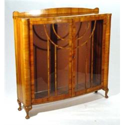 Art Deco design bow fronted walnut china cabinet with two glass shelves on cabriole legs