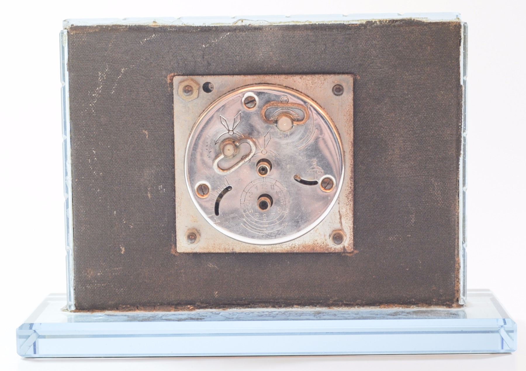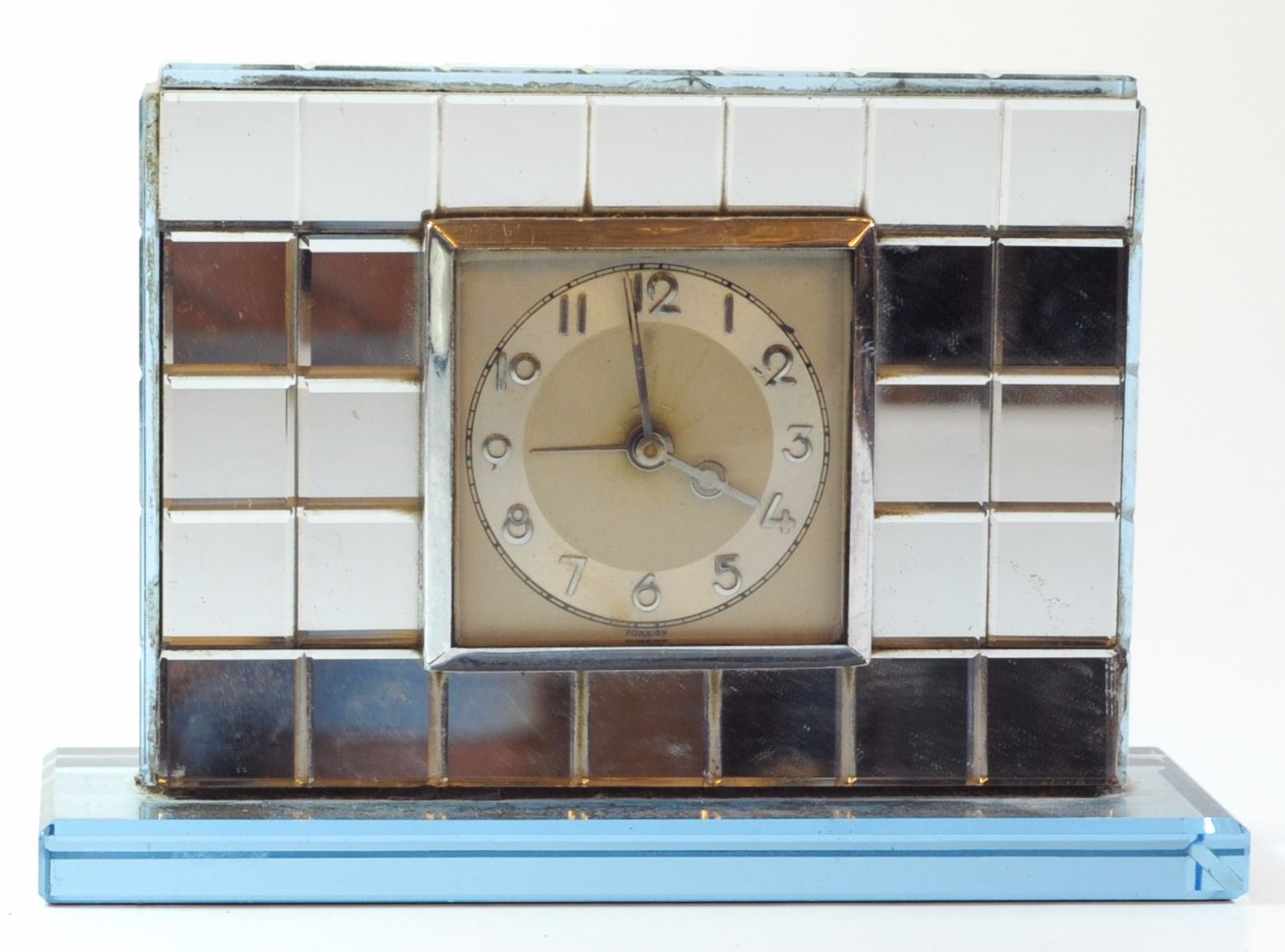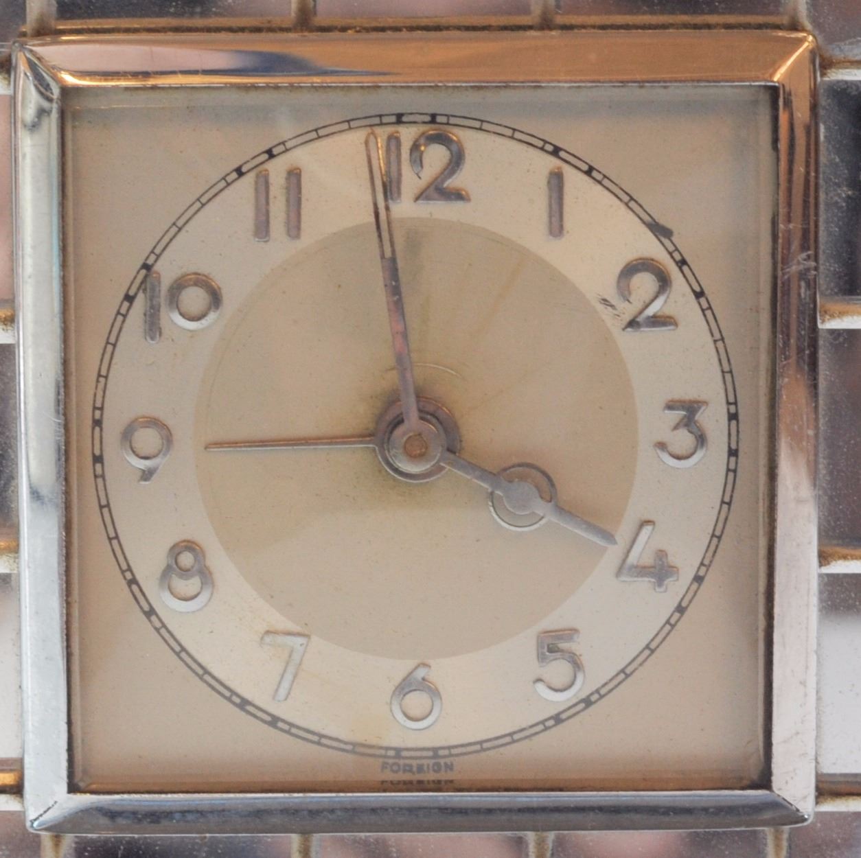 Art Deco desk alarm clock, glass base, upper has a tile-pattern glass cover, metal board with Arab digits, reads 'Foreign', in working condition. Height: 12 cm.