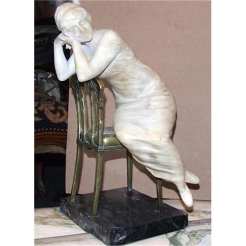 A fantastic Art Deco Alabaster sculpture of a Lady on bronze chair, mesuring 18 inches tall , 10"wide, 10" D, on marble stand.