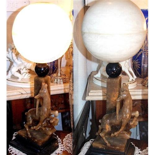 </font></strong>A beautiful Art Deco table Lamp , carved in marble and alabaster , with exquisite detail, circa 1920 to 1940 , featuring a running Antelope and a big round transparent ( the moon) white alabaster shade in perfect original conditions .