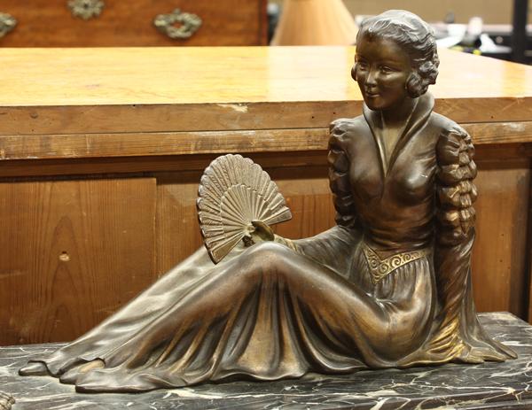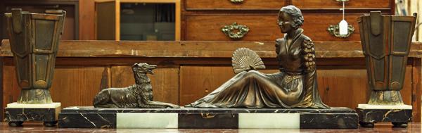 French Art Deco patinated bronze sculpture with garniture, circa 1890, the sculpture depicting a seated beauty with her Borzoi, rising on a rectangular marble plinth, overall dimensions: 38.5''w s 11.5''h x 7.5''d, the urn form garniture having a tapering form and rising on a marble plinth, 11''h