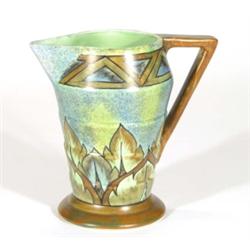 Art Deco stepped jug with angular handle with a brown flame pattern onto a mottled green and blue gr