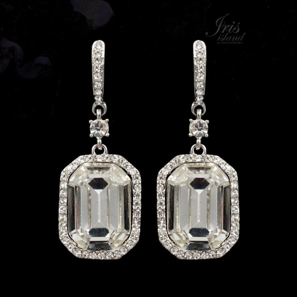Art Deco Gatsby-style clear Czech crystals set into rhodium plated drop dangle earrings. Length: 1.75" . 9996-040118-EB-20718