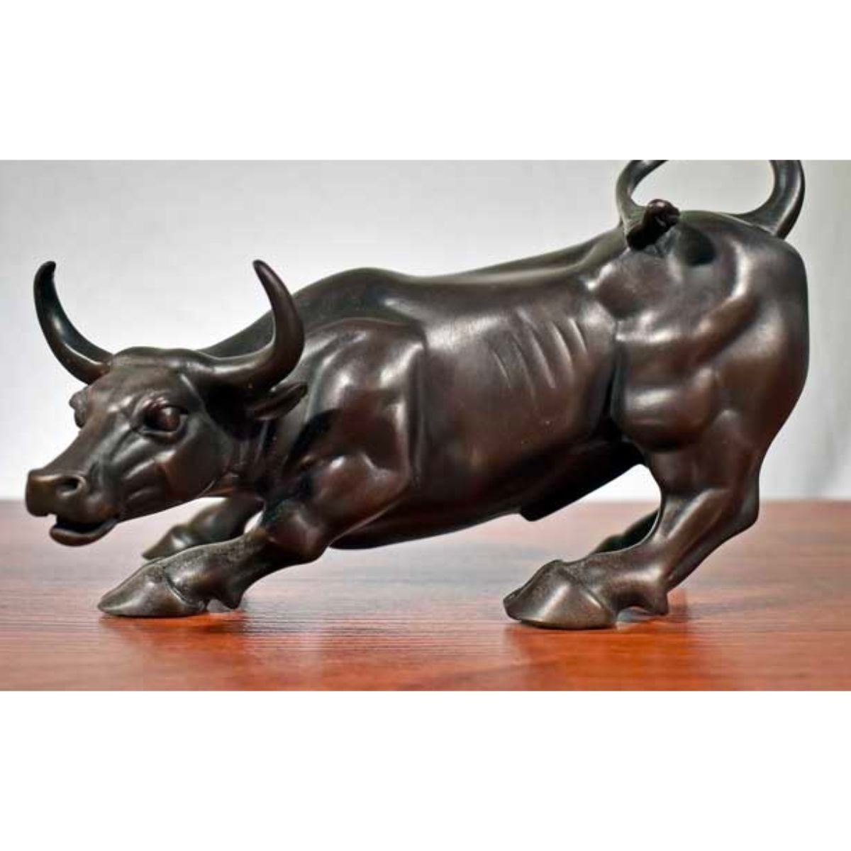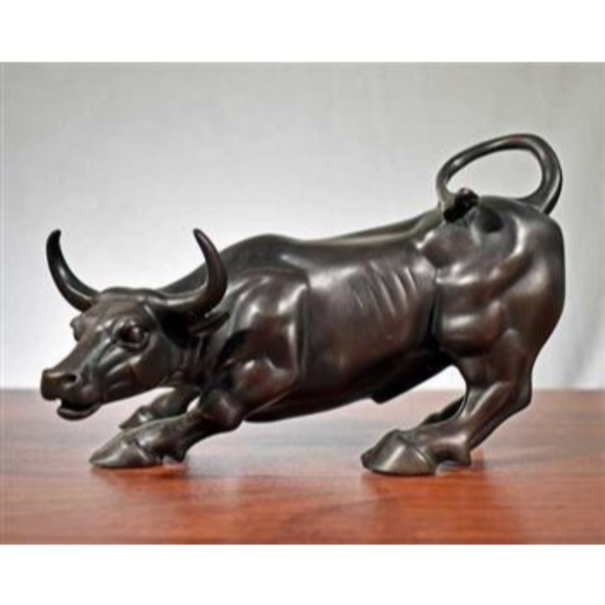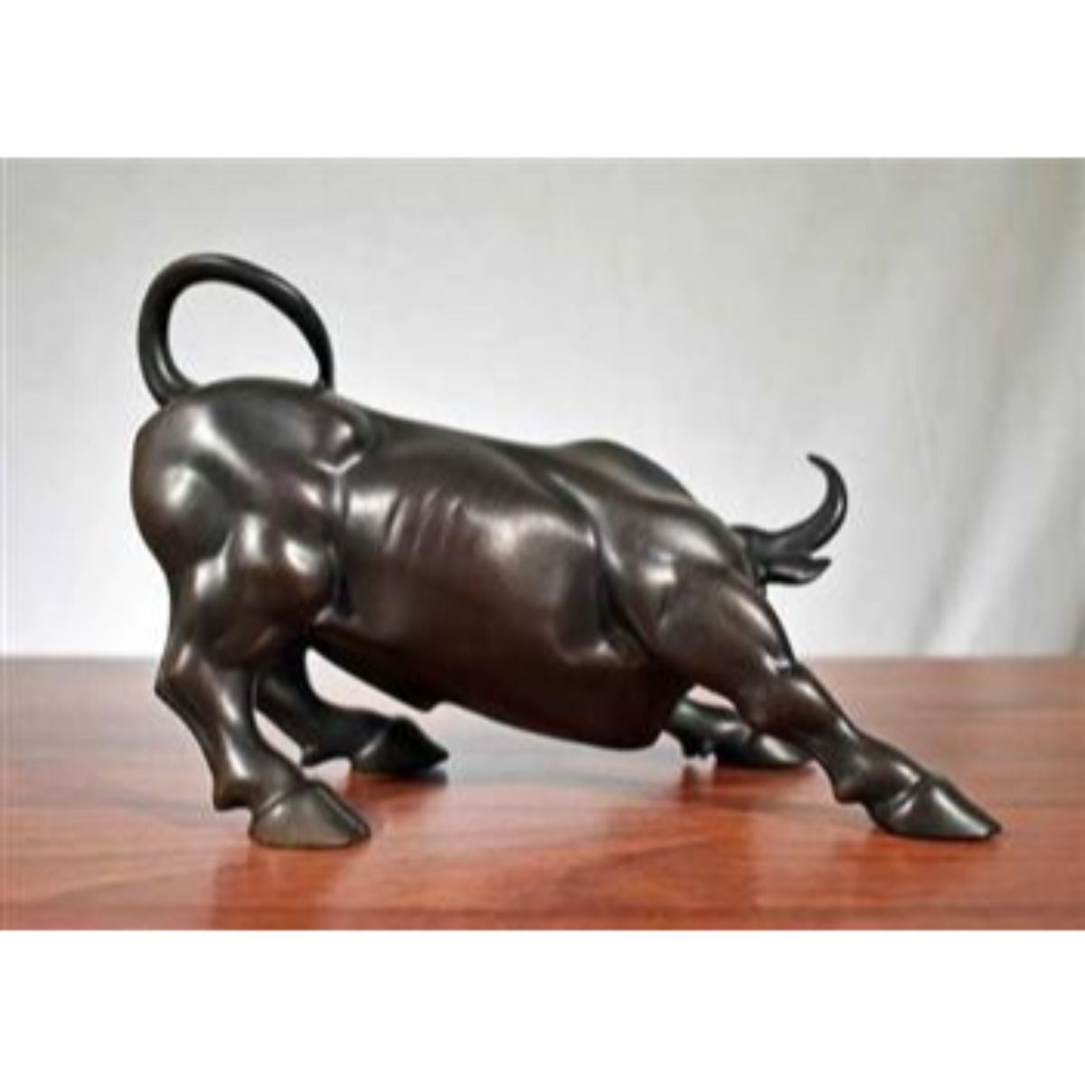 Art Deco-style Stock Market Trading Bull sculpture. Lost wax casting bronze, with brown patina. 5" H X 9" W. 4lbs.Â