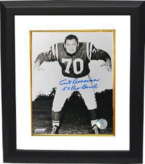 Art Donovan started playing professional football with the Baltimore Colts in 1950. He became one of the stars in an outstanding defense and was selected to five straight Pro Bowls for 1954 to 1958. The Colts won back to back championships in 1958 and 1959. He was selected to the Pro Football Hall of Fame in 1968. Art Donovan has hand autographed this Baltimore Colts 16x20 Photo with 5 X Pro Bowl inscription. Ironclad Hologram and Certificate of Authenticity. Custom White Mat and Premium Black Color Framed as shown.