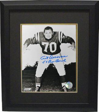Art Donovan started playing professional football with the Baltimore Colts in 1950. He became one of the stars in an outstanding defense and was selected to five straight Pro Bowls for 1954 to 1958. The Colts won back to back championships in 1958 and 1959. He was selected to the Pro Football Hall of Fame in 1968. Art Donovan has hand autographed this Baltimore Colts 8x10 Photo with 5 X Pro Bowl inscription. Ironclad Hologram and Certificate of Authenticity. Custom Black Mat and Premium Black Color Frame.
