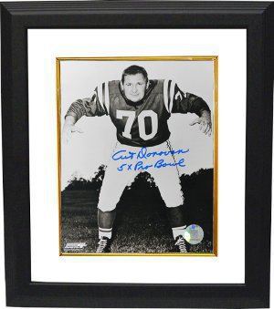 Art Donovan started playing professional football with the Baltimore Colts in 1950. He became one of the stars in an outstanding defense and was selected to five straight Pro Bowls for 1954 to 1958. The Colts won back to back championships in 1958 and 1959. He was selected to the Pro Football Hall of Fame in 1968. Art Donovan has hand autographed this Baltimore Colts 8x10 Photo with 5 X Pro Bowl inscription. Ironclad Hologram and Certificate of Authenticity. Custom White Mat and Premium Black Color Frame.