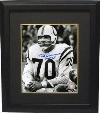 Art Donovan started playing professional football with the Baltimore Colts in 1950. He became one of the stars in an outstanding defense and was selected to five straight Pro Bowls for 1954 to 1958. The Colts won back to back championships in 1958 and 1959. He was selected to the Pro Football Hall of Fame in 1968. Art Donovan has hand autographed this Baltimore Colts 8x10 Photo with HOF68 inscription. Custom Black Mat and Premium Black Color Frame as shown. Certificate of Authenticity from Athlon Sports.