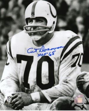 Art Donovan started playing professional football with the Baltimore Colts in 1950. He became one of the stars in an outstanding defense and was selected to five straight Pro Bowls for 1954 to 1958. The Colts won back to back championships in 1958 and 1959. He was selected to the Pro Football Hall of Fame in 1968. Art Donovan has hand autographed this Baltimore Colts 8x10 Photo with HOF68 inscription. Certificate of Authenticity from Athlon Sports.