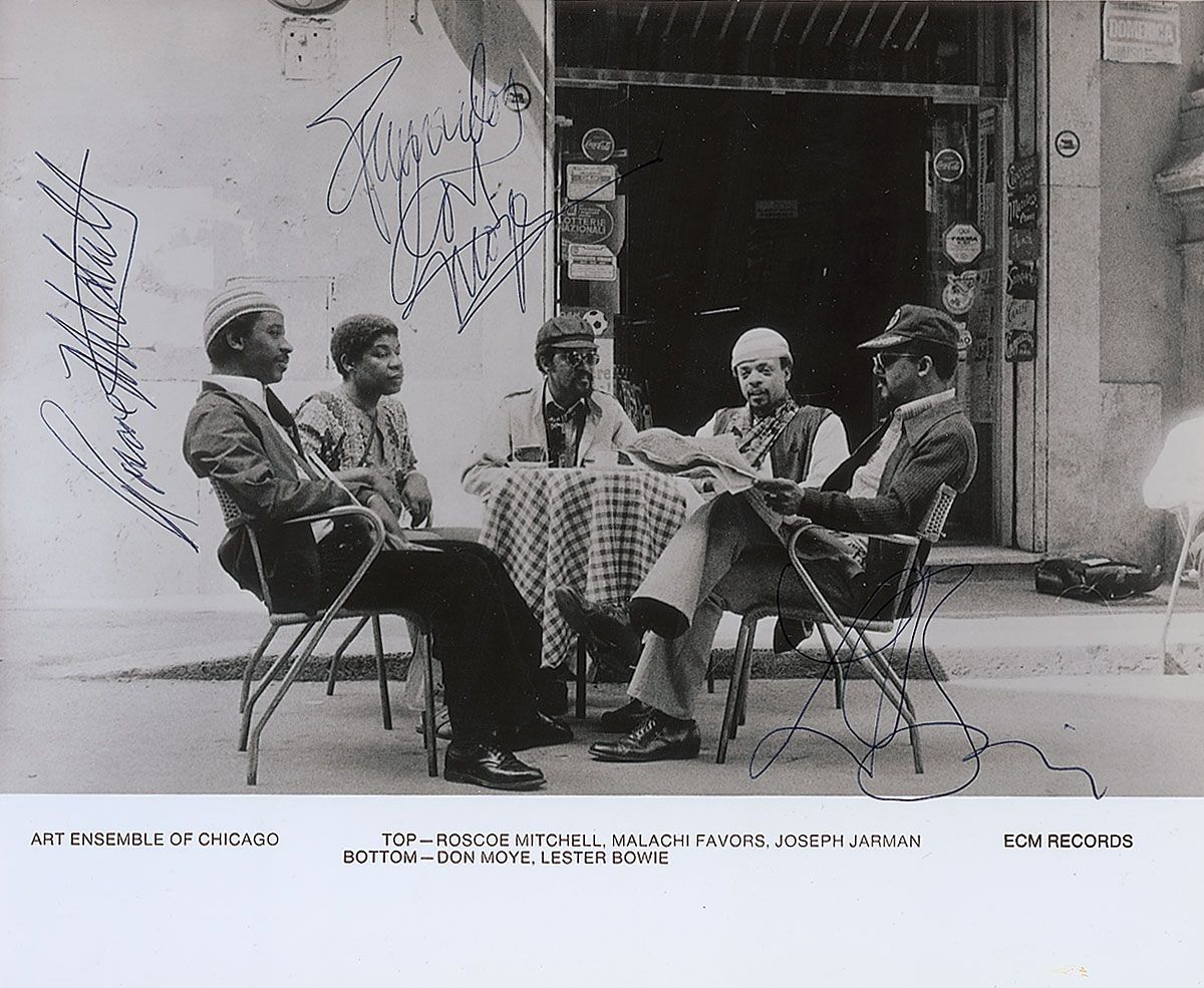 Glossy 9.75 x 8 ECM Records publicity photo of the group sitting around an outdoor table, signed in black ballpoint by Roscoe Mitchell, Don Moye, and Lester Bowie. In fine condition, with a bit of light skipping to beginning of Moye’s signature.