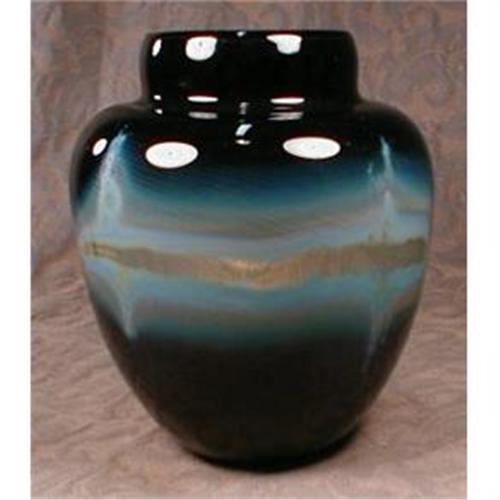 Dramatic, hand fashioned art glass vase. Primarily dark blue with an exposed band of light
